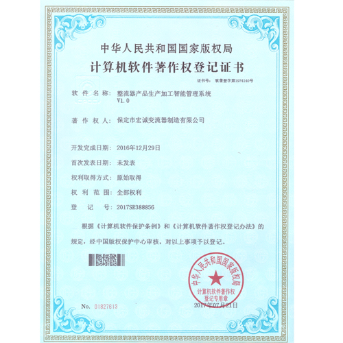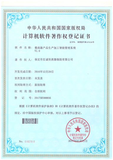 計算機(jī)軟件注冊權(quán)登記證書——整流器產(chǎn)品生產(chǎn)加工智能管理系統(tǒng)V1.0