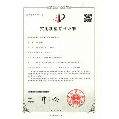 實用新型專利證書一種變速風(fēng)機(jī)驅(qū)動保護(hù)裝置