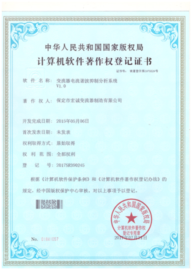 計(jì)算機(jī)軟件注冊(cè)權(quán)登記證書(shū)——變流器電流諧波抑制分析系統(tǒng)V1.0