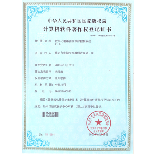 計(jì)算機(jī)軟件注冊(cè)權(quán)登記證書(shū)——數(shù)字化電路測(cè)控保護(hù)控制系統(tǒng)V1.0